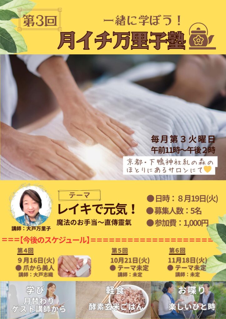 イベント 8月度月イチ万里子塾を開催します! 2025年7月28日 2025年9月15日 mariko Facebook Twitter はてブ Pocket Feedly 8月は私の【れいきで元気!】をお話させていただきます。どうぞお気軽にご参加下さいね。お待ちしています。 場所は下鴨神社のすぐ横のサロンです。 Facebook Twitter はてブ Pocket Feedly